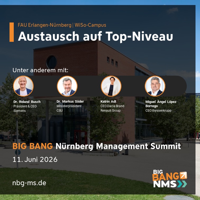 On 11 June 2026, the BIG BANG Nuremberg Management Summit 2026 will take place at FAU Erlangen-Nuremberg.